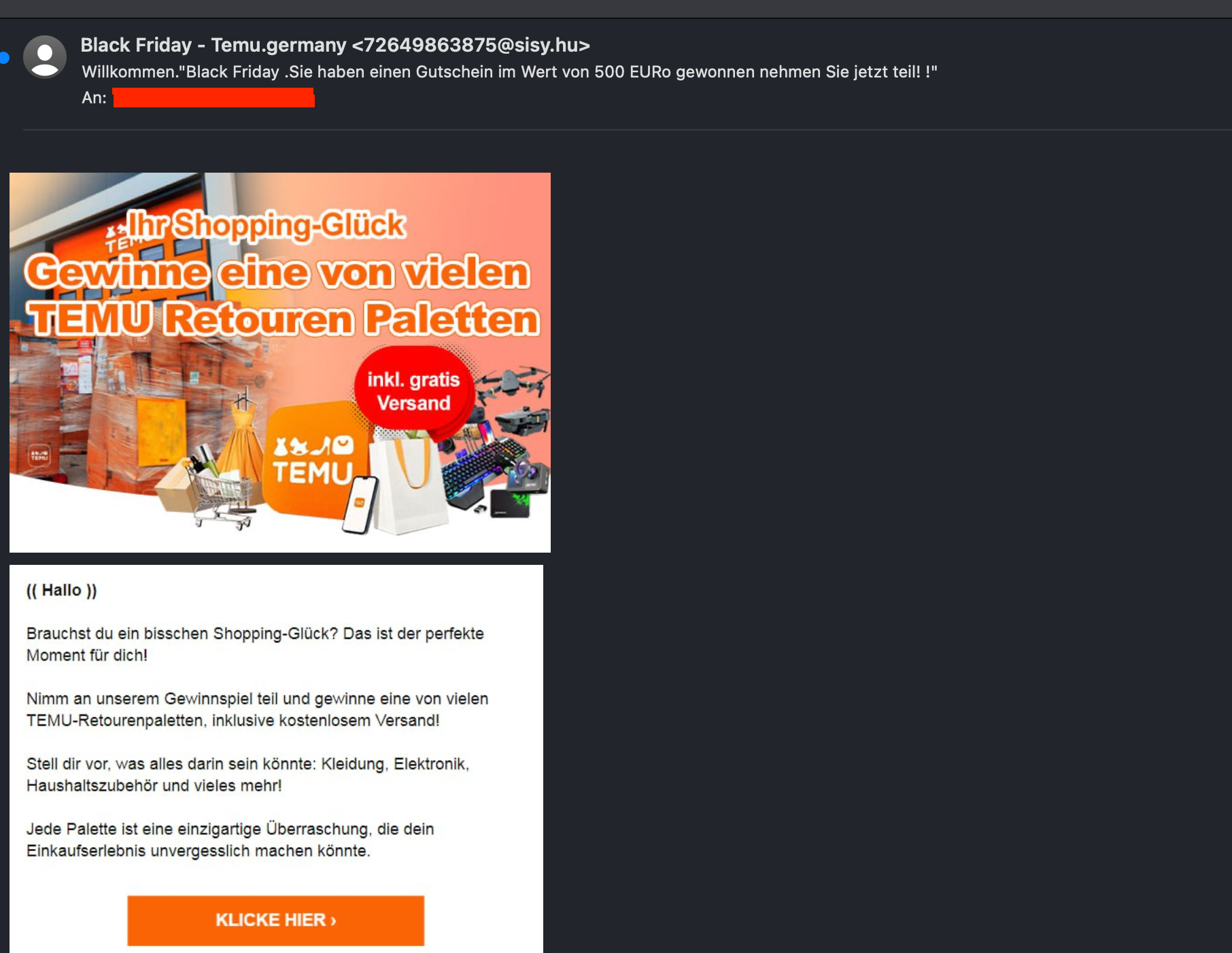 Ganz oben auf der Liste der beliebtesten Spam- und Phishig-Maschen zu Black Friday 2024 stehen Fake-Gutscheine großer Online-Händler. Dabei erhalten die Opfer E-Mails von Shoppingplattformen wie Otto, temu, Rossmann, Zalando und Co. mit einem Gutschein über einen angeblichen Sachgewinn. Um den Gutschein einzulösen, sollen sie sich über einen Link in der Spam-Mail einloggen. Dabei gehen Anmeldename und Passwort sofort an die Betrüger.