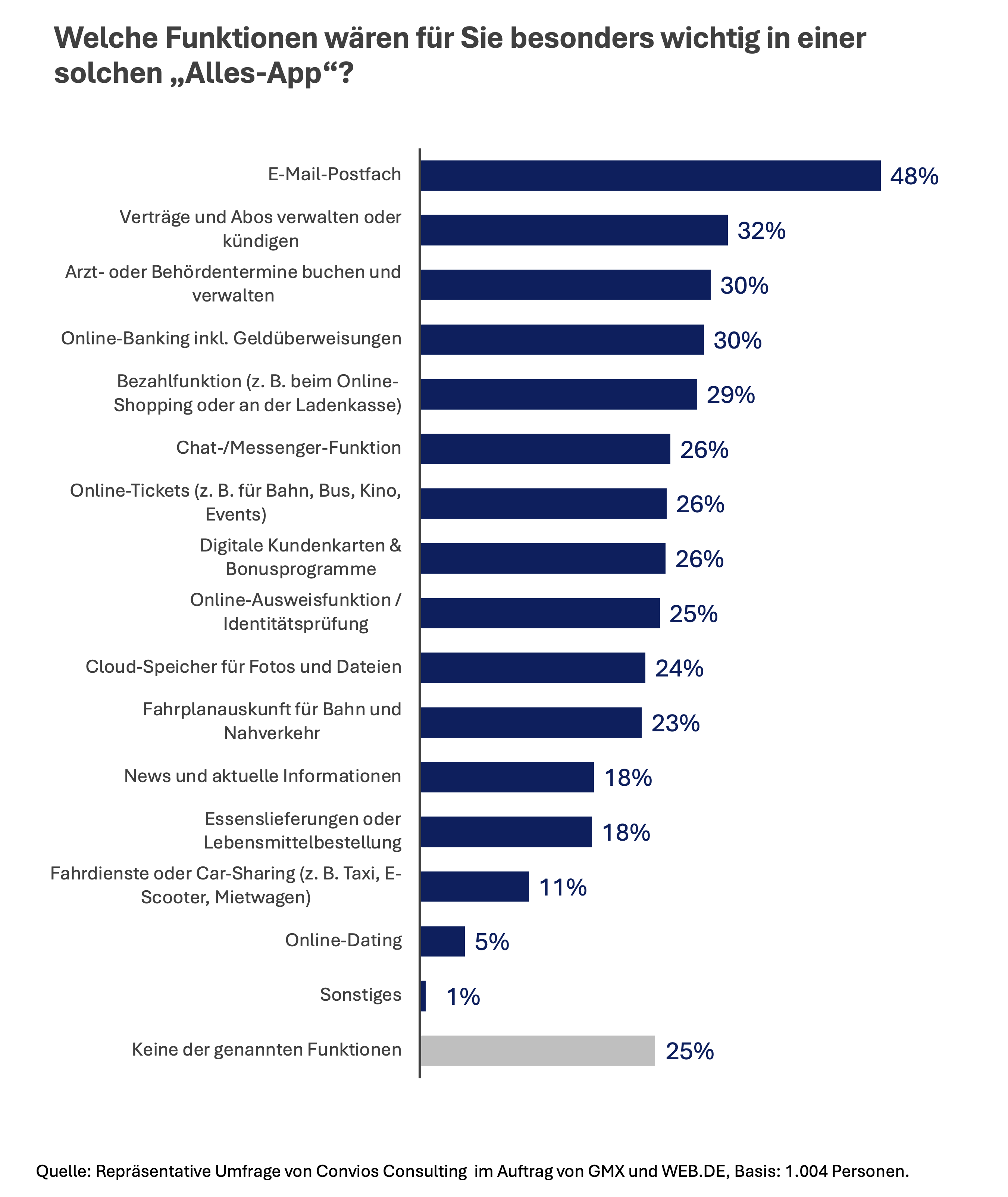 Potenzielle künftige All-in-One-Apps, die mehrere digitale Dienste bündeln, stoßen bei 40 Prozent der Befragten auf Interesse. Für 48 Prozent wäre in einer solchen „Super-App“ ein integriertes E-Mail-Postfach die wichtigste Funktion – noch vor Chat- oder Messenger-Diensten (26 %), Bezahlfunktionen (29 %) oder der Möglichkeit, Online-Termine bei Ärzten und Behörden zu vereinbaren (30 %).