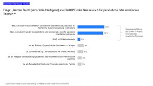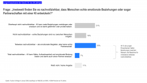 Nur eine kleine Minderheit der Befragten sieht in der KI einen Ratgeber bei Beziehungsproblemen in Partnerschaft oder Ehe (6 %), bei Streit in Freundschaft und Familie (6 %) oder einen „Zuhörer“ für persönliche Gedanken und Sorgen (9 %). Die Skepsis gegenüber künstlicher Nähe sitzt tief: So finden es zwei Drittel der Bevölkerung (67 %) nicht nachvollziehbar, dass Menschen echte emotionale Bindungen oder gar Partnerschaften mit einer KI entwickeln könnten.