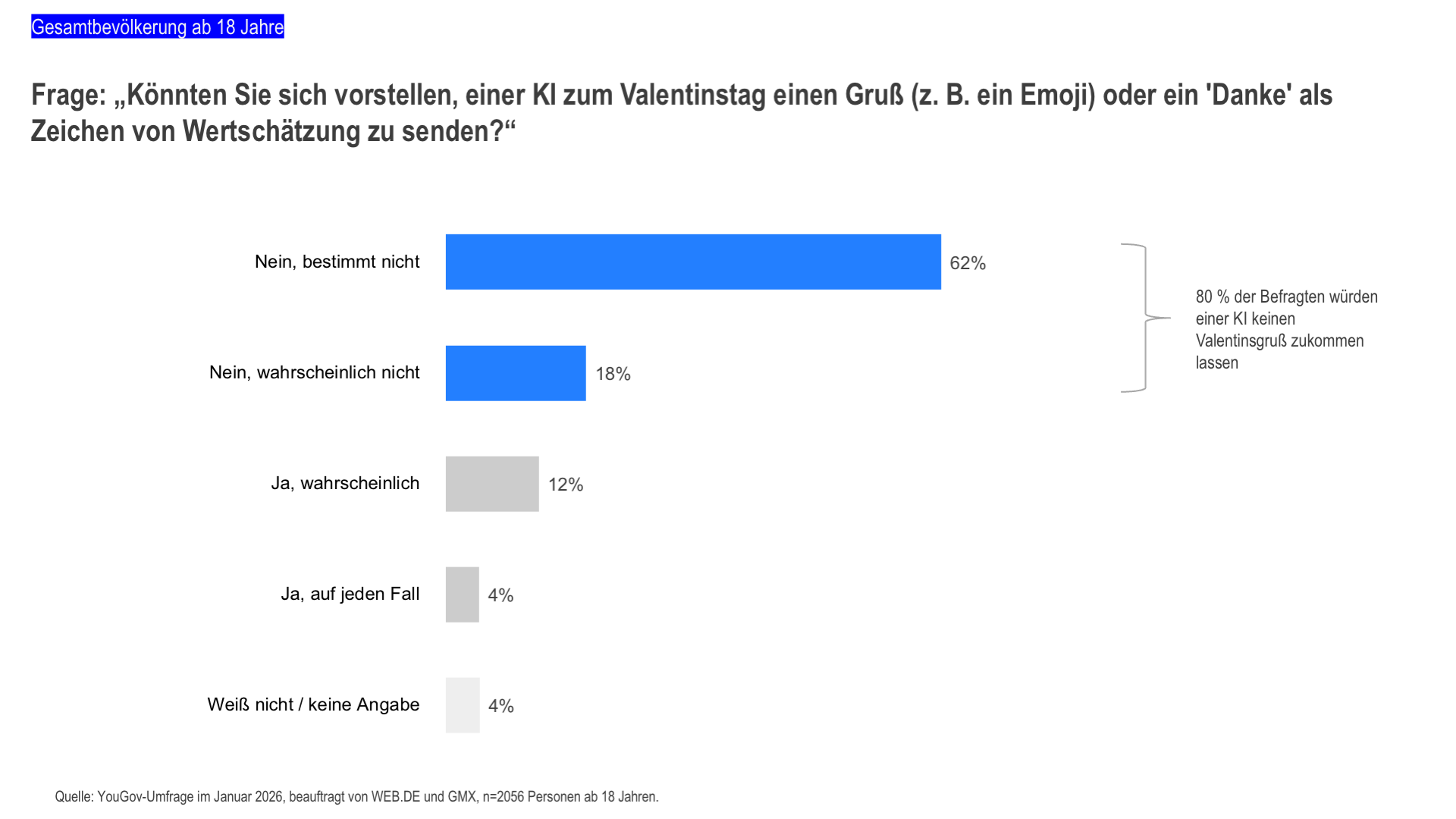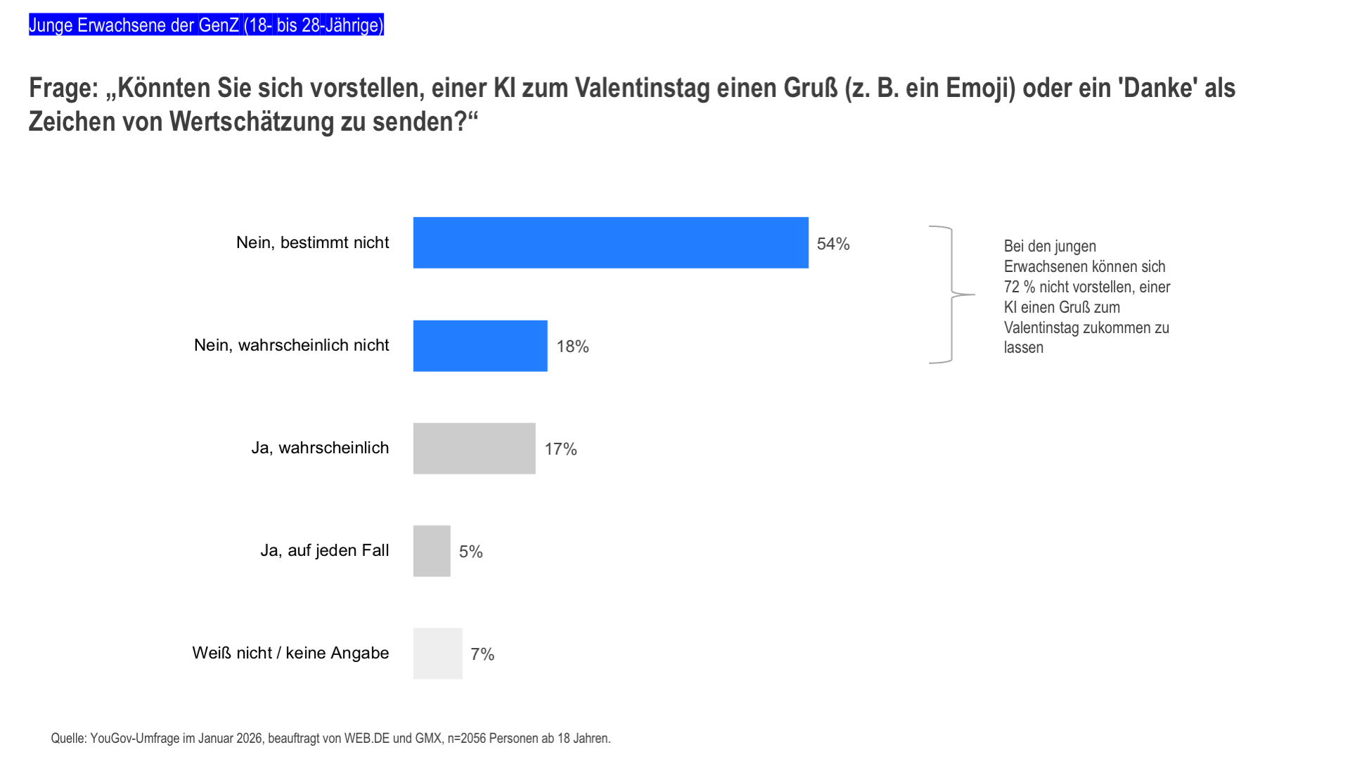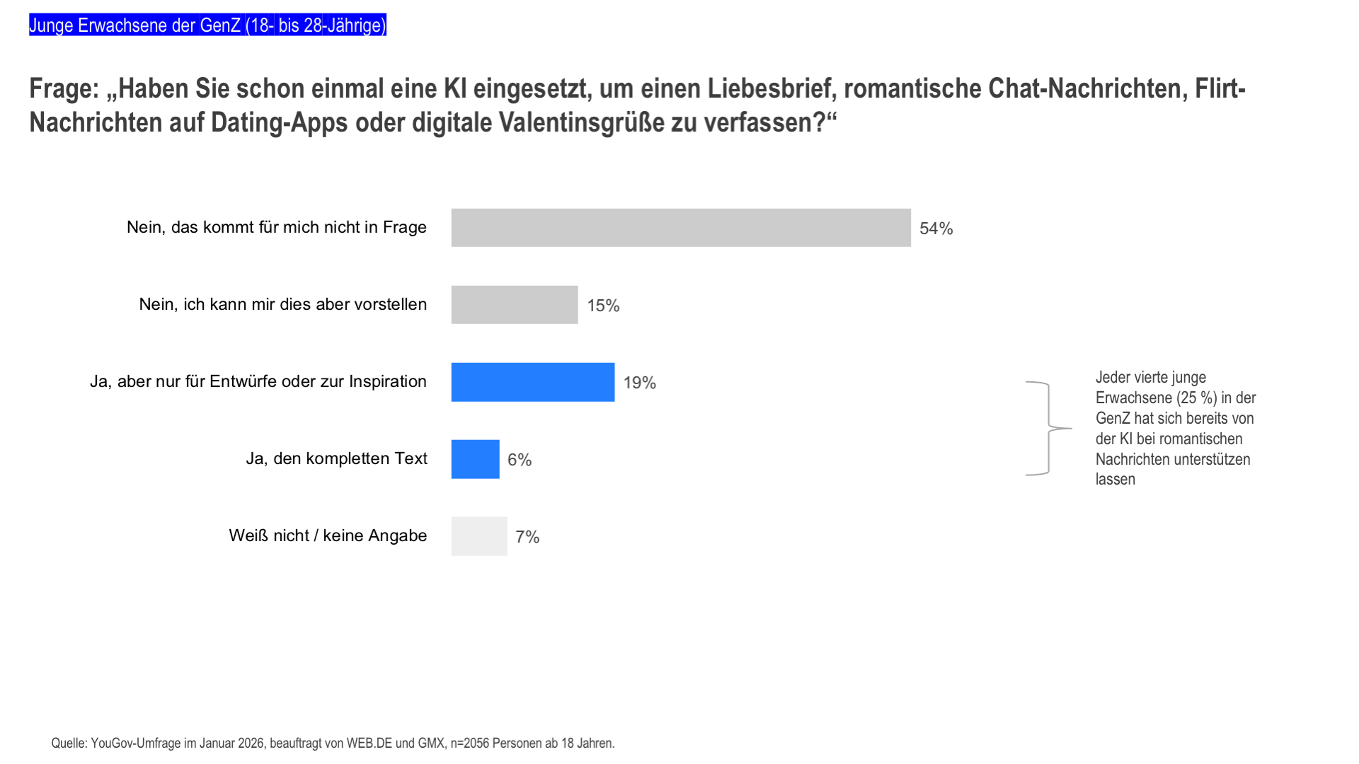 37 Prozent der 18- bis 29-Jährigen nutzen KI auch in diesem privaten Bereich. Das zeigt eine repräsentative YouGov-Umfrage im Auftrag von GMX und WEB.DE zum Valentinstag 2026