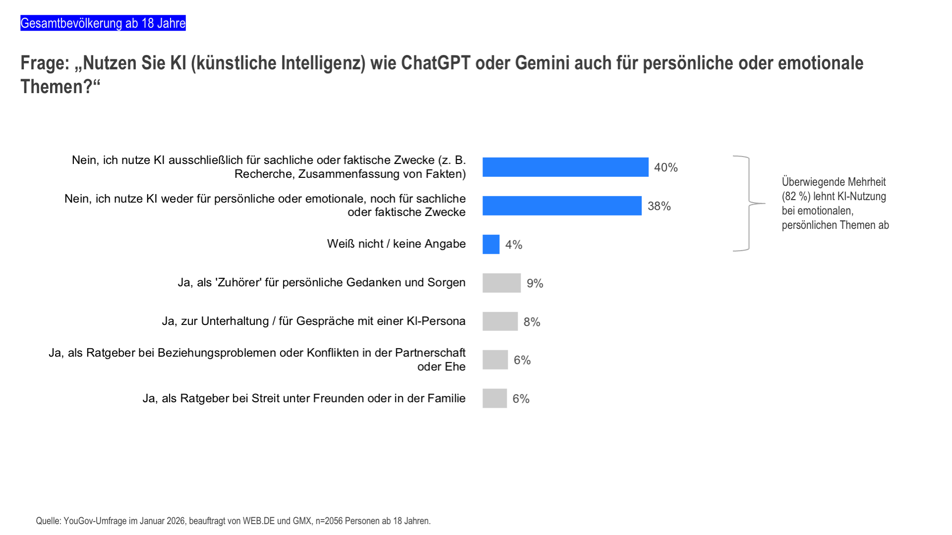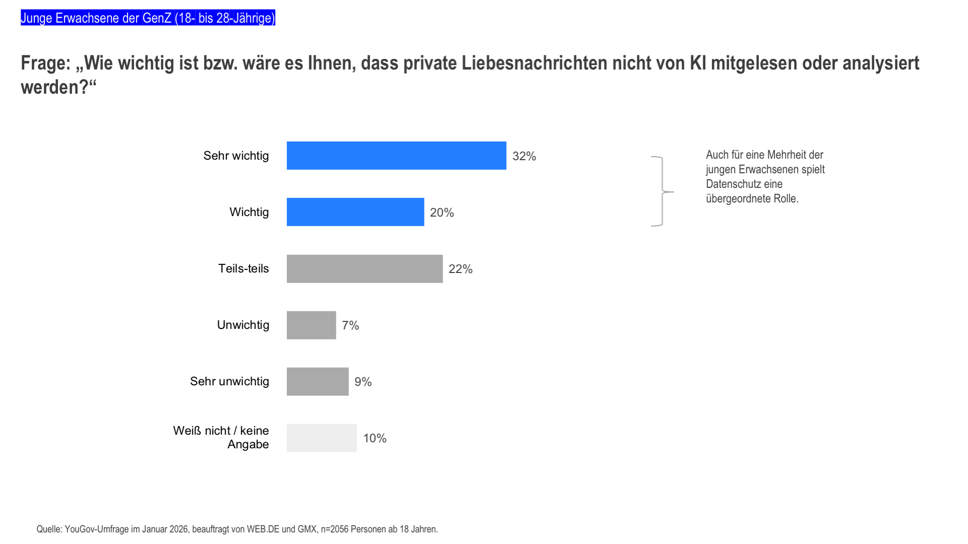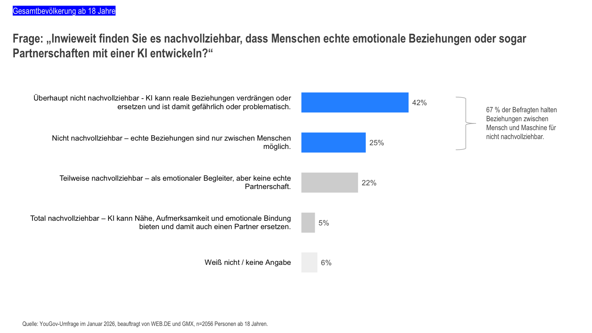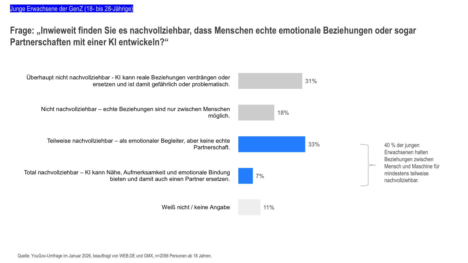 37 Prozent der 18- bis 29-Jährigen nutzen KI auch in diesem privaten Bereich. Das zeigt eine repräsentative YouGov-Umfrage im Auftrag von GMX und WEB.DE zum Valentinstag 2026