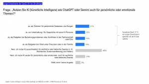 Ein anderes Bild zeigt sich bei den 18- bis 28-Jährigen. Die GenZ hat deutlich weniger Berührungsängste mit ChatGPT und Co. So verwenden bereits 37 Prozent dieser Altersgruppe KI, um über persönliche oder emotionale Themen zu sprechen. Jeder und jede Vierte (25 %) hat bereits KI-Hilfe für romantische Texte in Anspruch genommen. Zudem halten 40 Prozent eine echte emotionale Bindung zwischen Mensch und Maschine für nachvollziehbar – ein deutlicher Unterschied zum Rest der Bevölkerung.