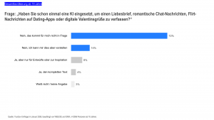 Besonders deutlich fällt die Absage an die KI bei romantischer Korrespondenz aus: Für 72 Prozent der Deutschen kommt es nicht in Frage, eine KI für das Verfassen von Liebesbriefen, Flirt-Nachrichten oder Valentinsgrüßen einzusetzen. Noch größer ist die Distanz gegenüber der Maschine selbst: 80 Prozent würden „ihrer KI“ zum Valentinstag nicht einmal einen kurzen Gruß oder ein „Danke“ als Zeichen der Wertschätzung senden.