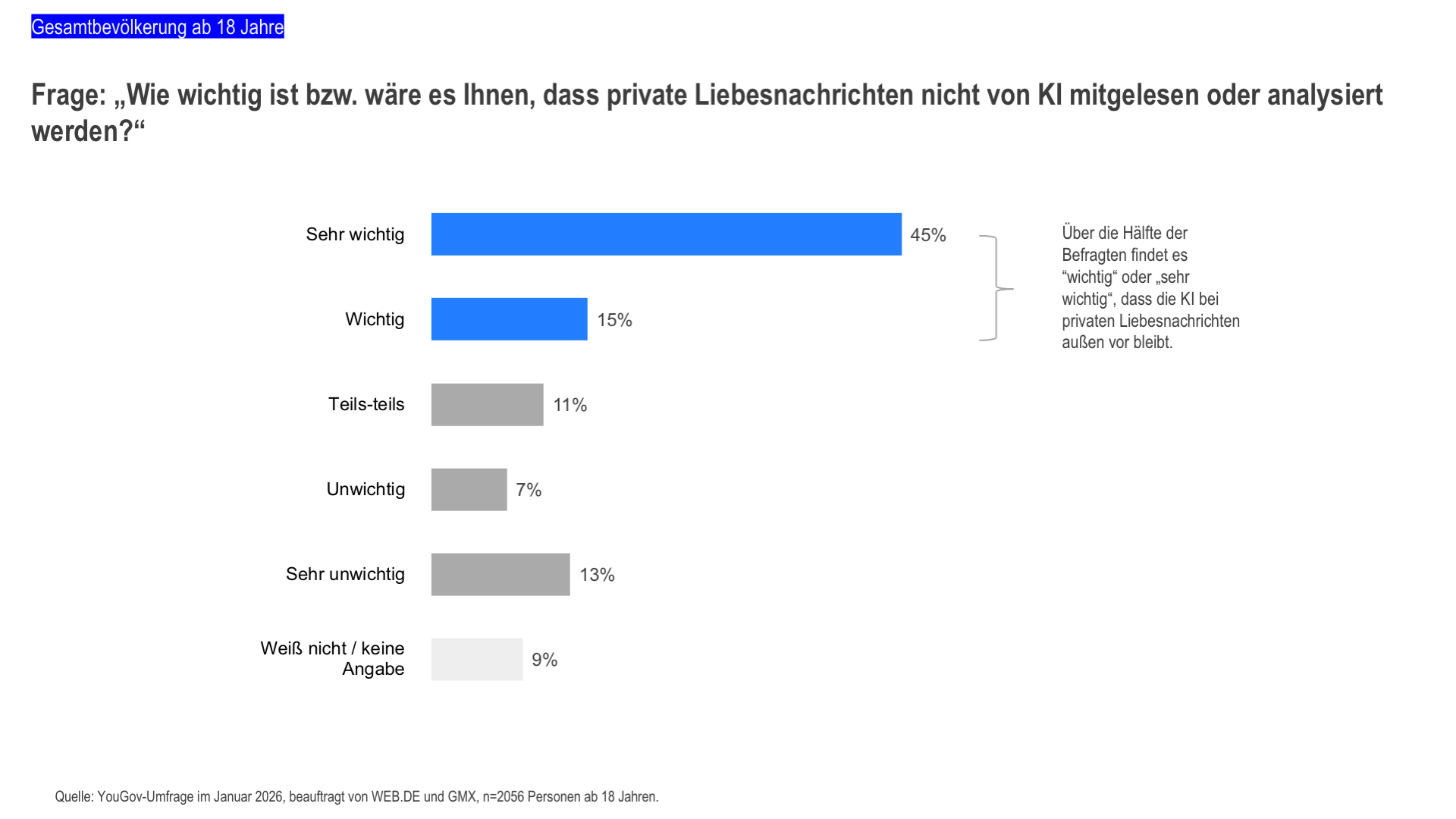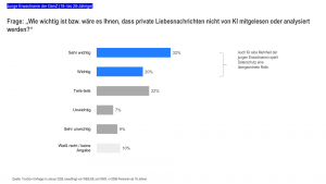 Unabhängig vom Alter eint die Deutschen der Wunsch nach digitaler Intimsphäre. In allen Altersgruppen ist es über 50 Prozent der Befragten wichtig, dass private Liebesnachrichten nicht von KI-Algorithmen mitgelesen oder analysiert werden.