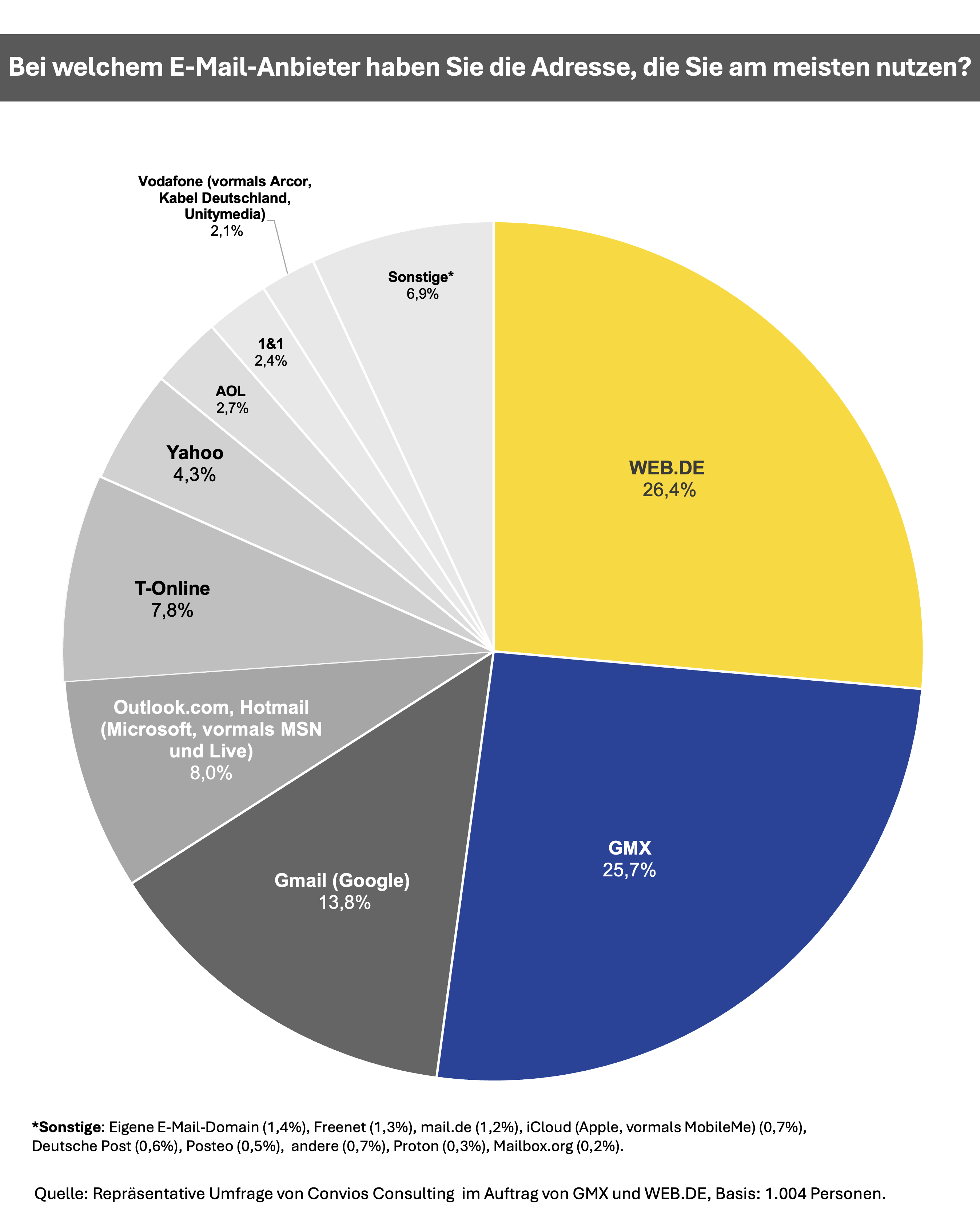 Aktuell haben 13,8 Prozent der Deutschen ihre Haupt-Adresse bei Gmail. Der Marktanteil von WEB.DE steigt auf 26,4 Prozent (2024: 23,0 Prozent). GMX legt leicht von 25,2 auf 25,7 Prozent zu.